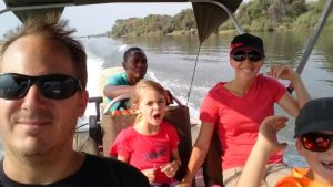Depuis Kasane, on se trouve à quelques kilomètres du parc Chobe. On peut le visiter en voiture, mais aussi en bateau. C’est ce que nous avaient conseillé les Girardin lors de notre préparation de la partie « Afrique » du tour du monde. Ils avaient pu tester les services de Charles, un guide local qui organise des visites privées du parc sur son bateau. Nous avons donc fait appel à ses services pour un Sunset Cruise, comprenez par là une croisière avec coucher de soleil. Le bateau est rudimentaire (coque alu, petit pare soleil) ce qui déçoit un peu les enfants au début. Puis le tour débute, chacun à sa place et Charles à la barre.