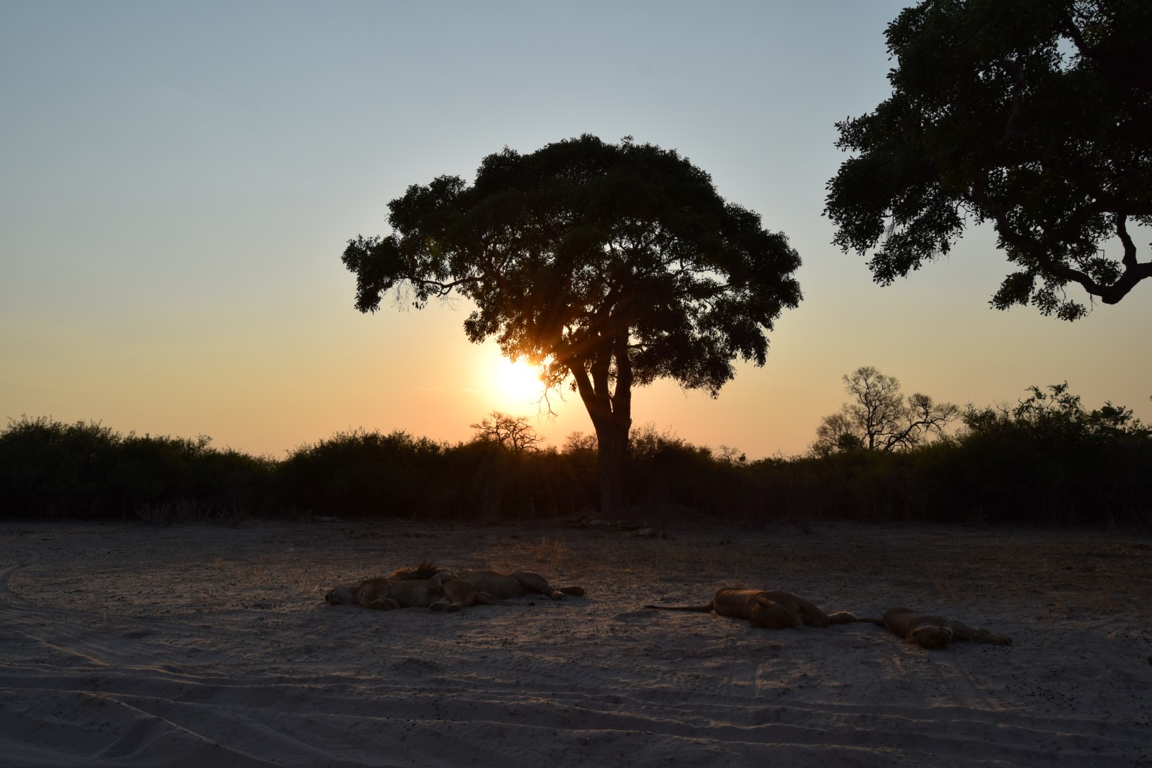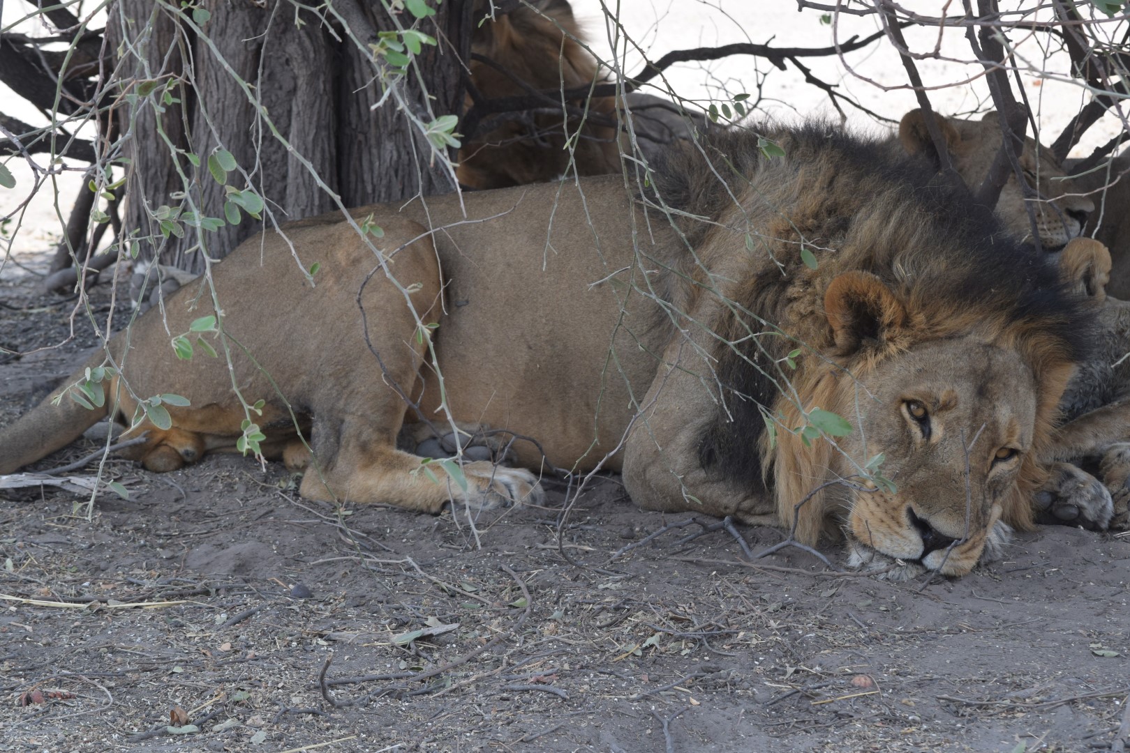 Nous continuons notre route vers le camp de Savuti, à 70 kms plus au sud, et après une bonne nuit nous partons, en milieu de matinée, faire un game drive. A l’entrée du camping, une ranger nous signale la présence de lions… On file donc à leur recherche et on tombe sur 2 gros paresseux, allongés de tout leur long à l’ombre, non loin de la route :