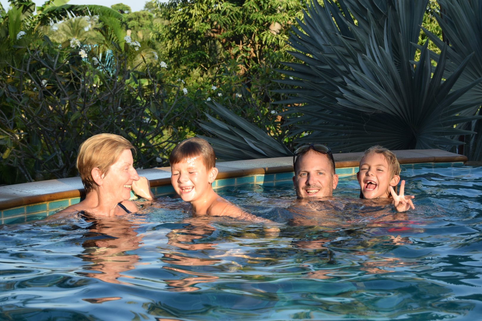 Trop belle la vie avec ces beaux palmiers derrière et Marguerite aux anges elle qui adore nager lol