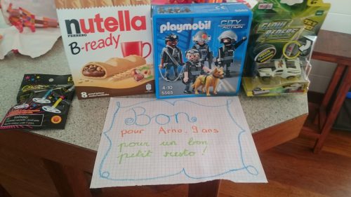 Trop la classe cette organisation de chef! On n’est pas encore assez débrouilles pour faire aussi bien , bravo pour les lasagnes, le gâteau, la déco et les cadeaux! Et bon anniversaire Arno avec du retard