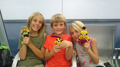Durant ces deux heures, les enfants ont été formidables ! Si souvent les aéroports, douanes et autres endroits où on doit patienter sont des occasions rêvées pour eux de faire les fous, là durant deux heures ils ont joué à cache-chache et à plein d’autres jeux pour nous laisser gérer la situation, on ne les a pas entendus, ils ont été des champions ! On a été tellement contents que tout se finisse bien et qu’ils nous aient laissés tranquilles qu’ils ont eu droit d’aller choisir un Minion en laine dans un stand de babioles de l’aéroport !