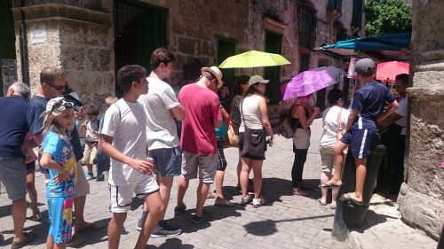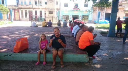 Mais on ne peut pas terminer nos aventures cubaines sans évoquer les points internet qui sont quand même une curiosité: sur certaines places publiques, le gouvernement a installé des hotspots wifi auxquels on peut accéder en achetant des cartes à gratter (à ce jour 1.5 USD pour une heure). Pas moyen de se connecter ailleurs que depuis ces hotspots étatiques, pour les touristes comme pour les Cubains! On se retrouve donc à une bonne cinquantaine de personnes sur ces places, entassés à l’ombre côte à côte, tous penchés sur les téléphones ou les tablettes. Sacré tutti frutti: des touristes appelant la maison pour donner des nouvelles, des Cubaines plus âgées hurlant dans leur téléphone pour se faire comprendre de leur maman, des enfants faisant du YouTube, des ados écoutant de la musique,… Bref une vraie pièce de théâtre à observer!
